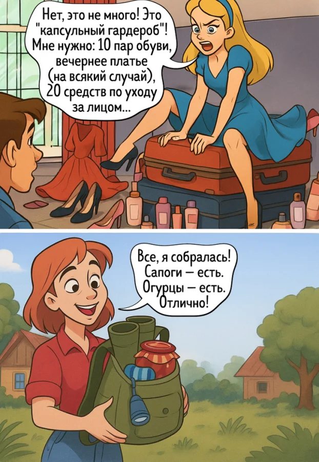 3. Городской житель собирает «капсульный гардероб» из пяти чемоданов. Деревенский — один рюкзак с сапогами и огурцами