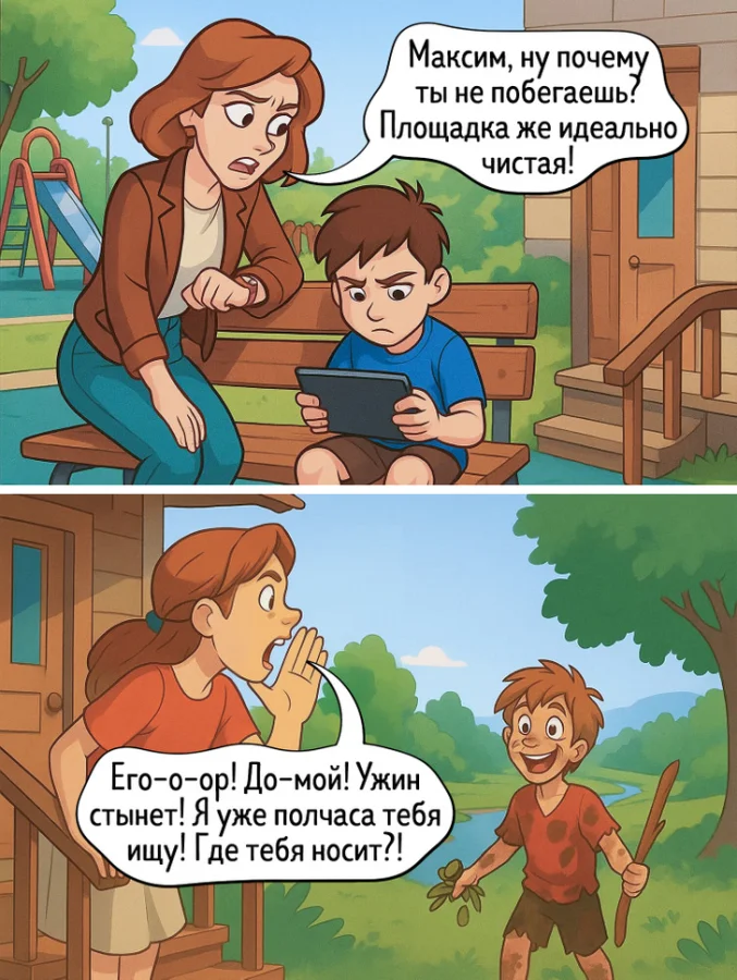 4. В городе ребенок сидит на чистой, огороженной площадке с планшетом. В деревне он пропадает в лесу, возвращаясь грязным, но с настоящими сокровищами