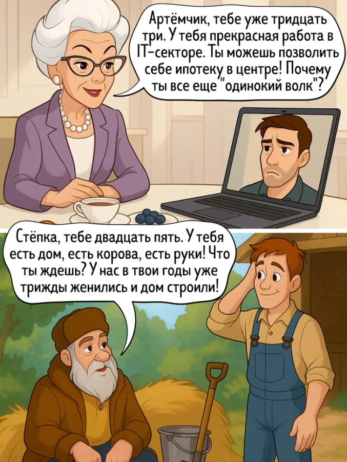 10. Город давит: «У тебя IT, почему нет ипотеки?» Деревня давит: «У тебя дом, корова и руки, почему до сих пор не женился?»