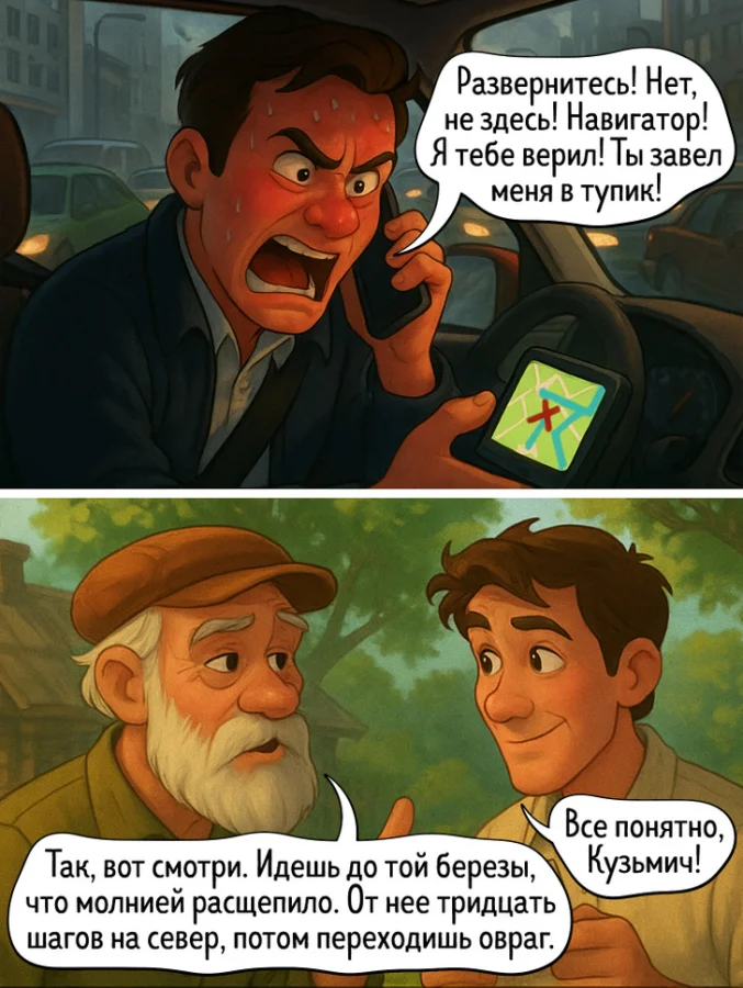 12. Городской навигатор может наврать и завести в тупик. Деревенский никогда не подведет, если ориентир — «береза, расщепленная молнией»
