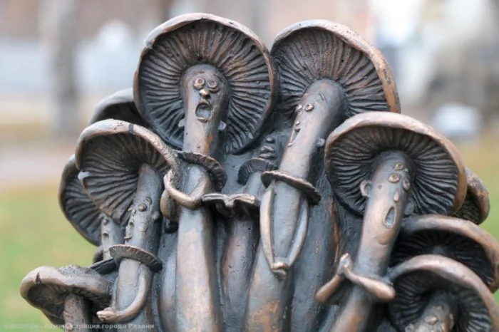 В городе установлено 13 маленьких «глазастых» грибов. У каждого свое хобби и свой характер: один читает, другой ловит рыбу, а третий готовится к дальнему путешествию. Скульптуры выполнены с художественной детализацией: можно разглядеть рельефы шляпок, текстуру ножек и даже маленьких насекомых.