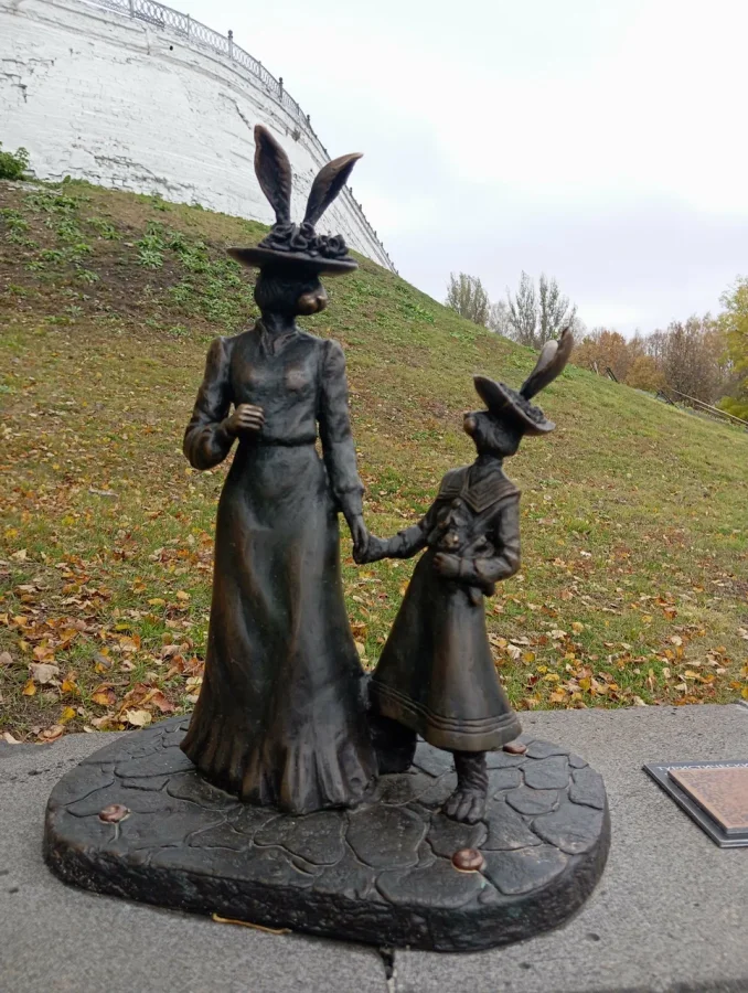 Зайчиха‑дама в модном наряде начала XX века гуляет с дочкой‑зайкой по лестнице с Верхней Набережной к Костромскому кремлю.