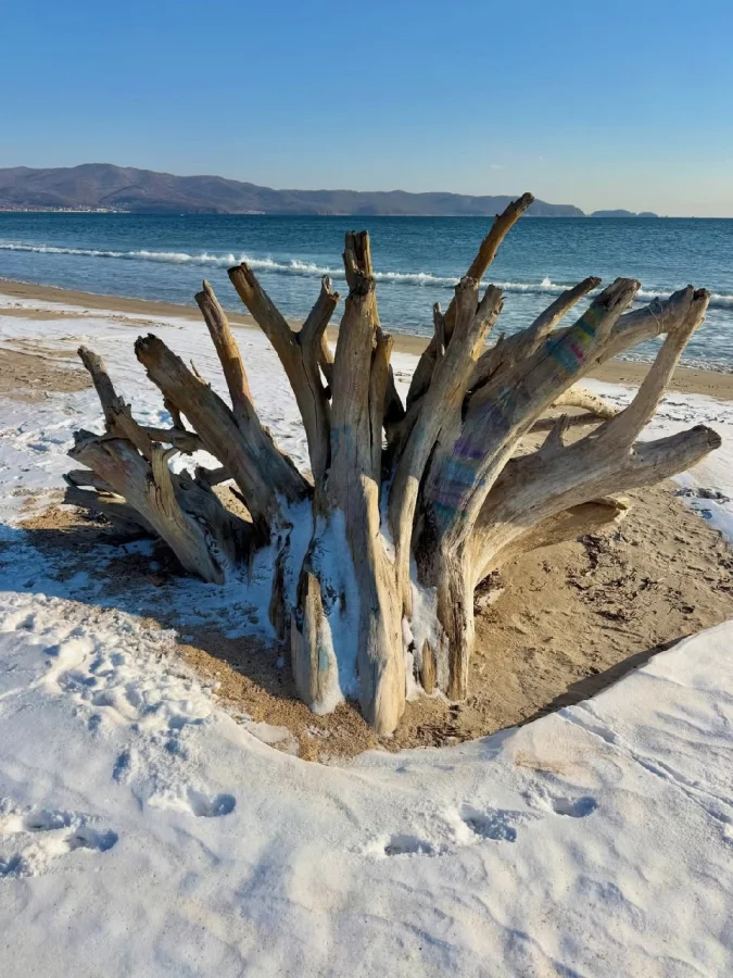 В такие моменты особенно ясно чувствуешь, как быстро меняются времена года. На пляже становится тише: звуки приглушены снегом, ветер приносит свежесть с открытой воды, а прозрачный зимний свет делает оттенки моря глубже. Кажется, будто Песочница на время забыла о своём летнем характере — о шуме туристов, горячем песке и бесконечном солнце — и надела спокойный зимний наряд.