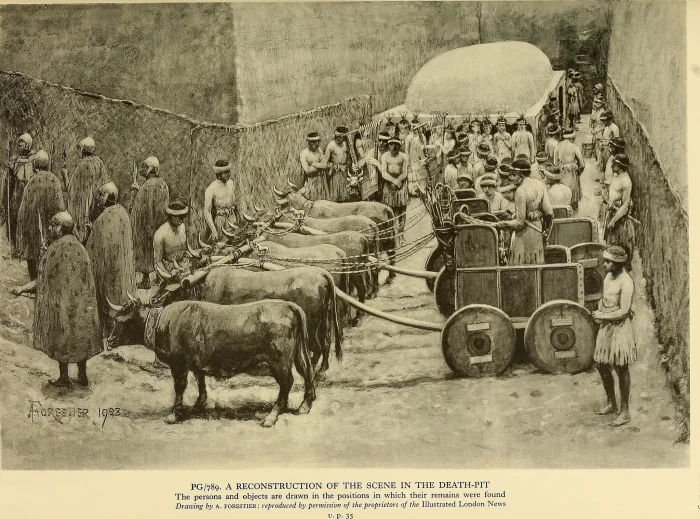 Именно так хоронили шумерскую царицу Пу-А-Би (Шубад) четыре с половиной тысячи лет назад – картину её похорон восстановил археолог Леонард Вулли.