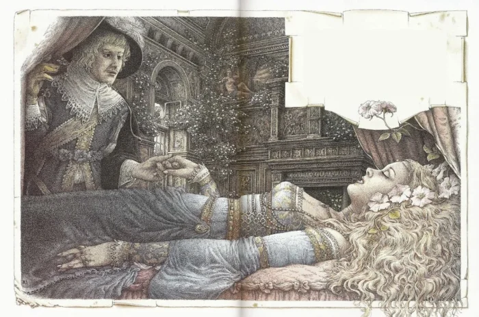 Он попытался ее разбудить, но ничего не получалось. Девушка очень понравилась королю, и тот не смог сдержать себя и изнасиловал ее. После этого он уехал в свое королевство, где его ждала жена. Через 9 месяцев Спящая красавица родила близнецов, будучи спящей. Новорожденные стали кричать от голода и сосать пальцы матери, удалив, таким образом, занозу от веретена. Так Спящая красавица пробудилась матерью-одиночкой с двумя детьми.