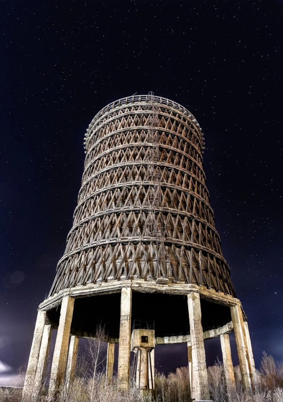 В начале прошлого века Шухов разработал революционный принцип сетчатых гиперболоидных конструкций — удивительно лёгких на вид, но невероятно прочных. Их геометрия идеально распределяет нагрузку, поэтому такие сооружения могут достигать впечатляющей высоты при минимальном расходе материалов. В 1948 году одна из таких инженерных форм была воплощена на Урале — и не из металла, а из дерева, что делает градирню Североуральска уникальной.