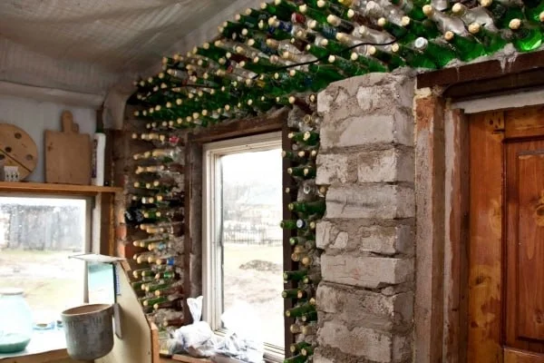 Так появился двухэтажный дом, который светится на солнце грунтовыми переливами стекла — особенно красиво он выглядит на рассвете и закате, когда бутылки будто загораются изнутри.