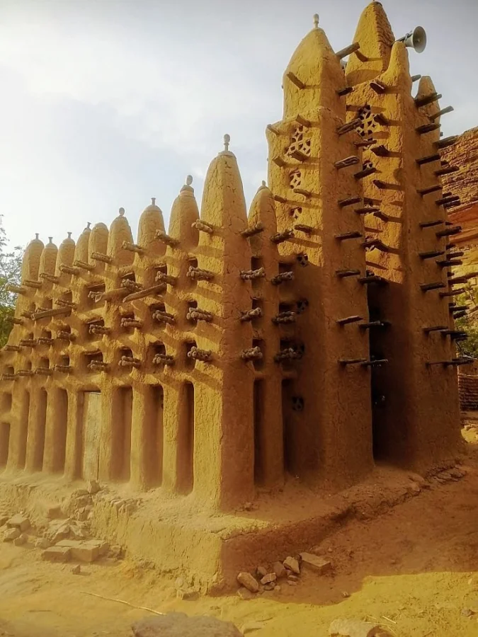 На заднем плане видны остатки жилищ древнего народа теллем, на переднем плане глиняная мечеть современной деревни догонов