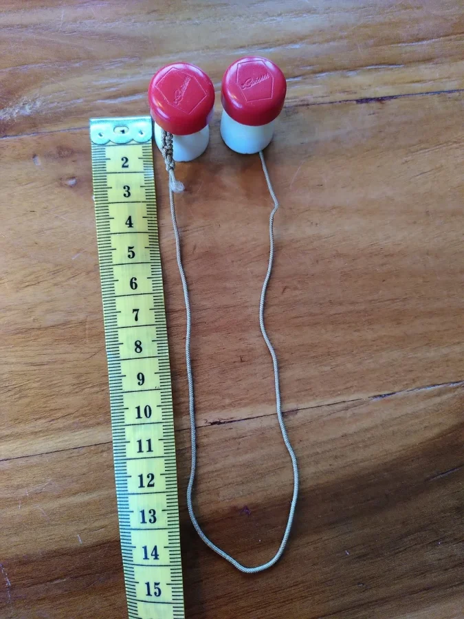 5. Два одинаковых красно-белых предмета из твердого пластика (около 2,5 см в высоту), соединённых эластичной проволокой (около 30 см)