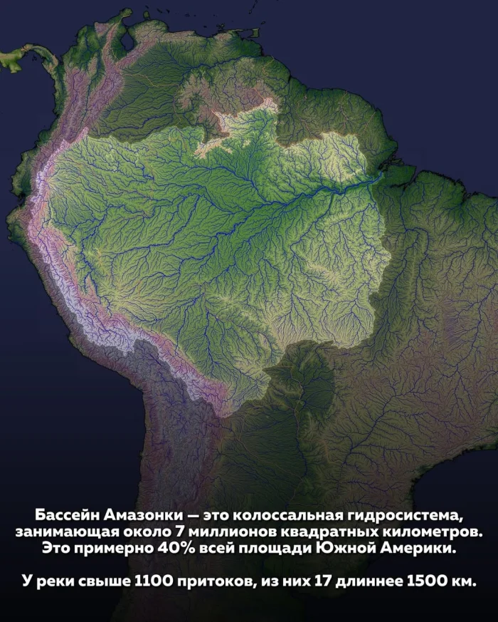 Амазонка — это не просто река, а гигантская природная система, масштаб которой сложно осознать. Её бассейн занимает около 7 миллионов квадратных километров — это почти 40% всей территории Южной Америки. Фактически, Амазонка охватывает земли сразу нескольких стран и влияет на климат всего континента.