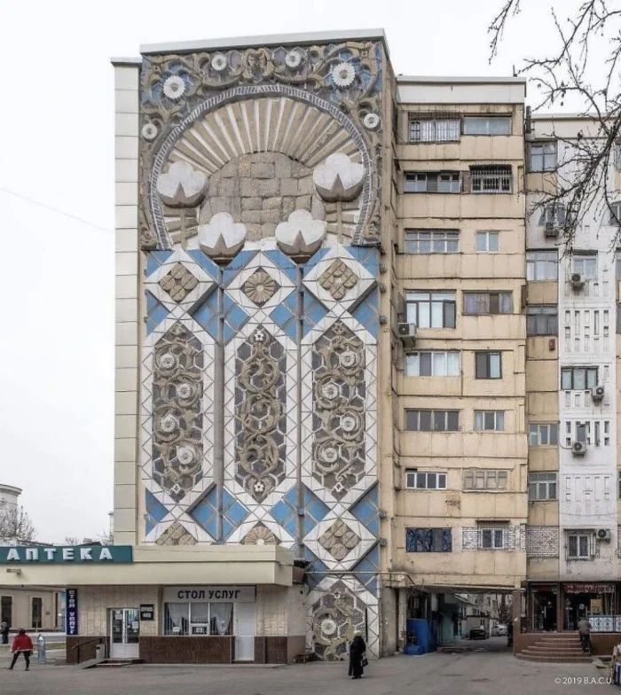 На фасаде жилого дома, построенного в 1974 году в Узбекистане, разместили панно с изображением хлопка - основного природного богатства республики