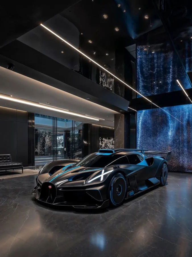 Отдельного внимания заслуживает выставочный зал для гиперкара Bugatti Bolide. Автомобиль размещён как арт-объект на фоне кинематографической LED-стены, подчёркивающей его агрессивные линии и статус произведения инженерного искусства.
