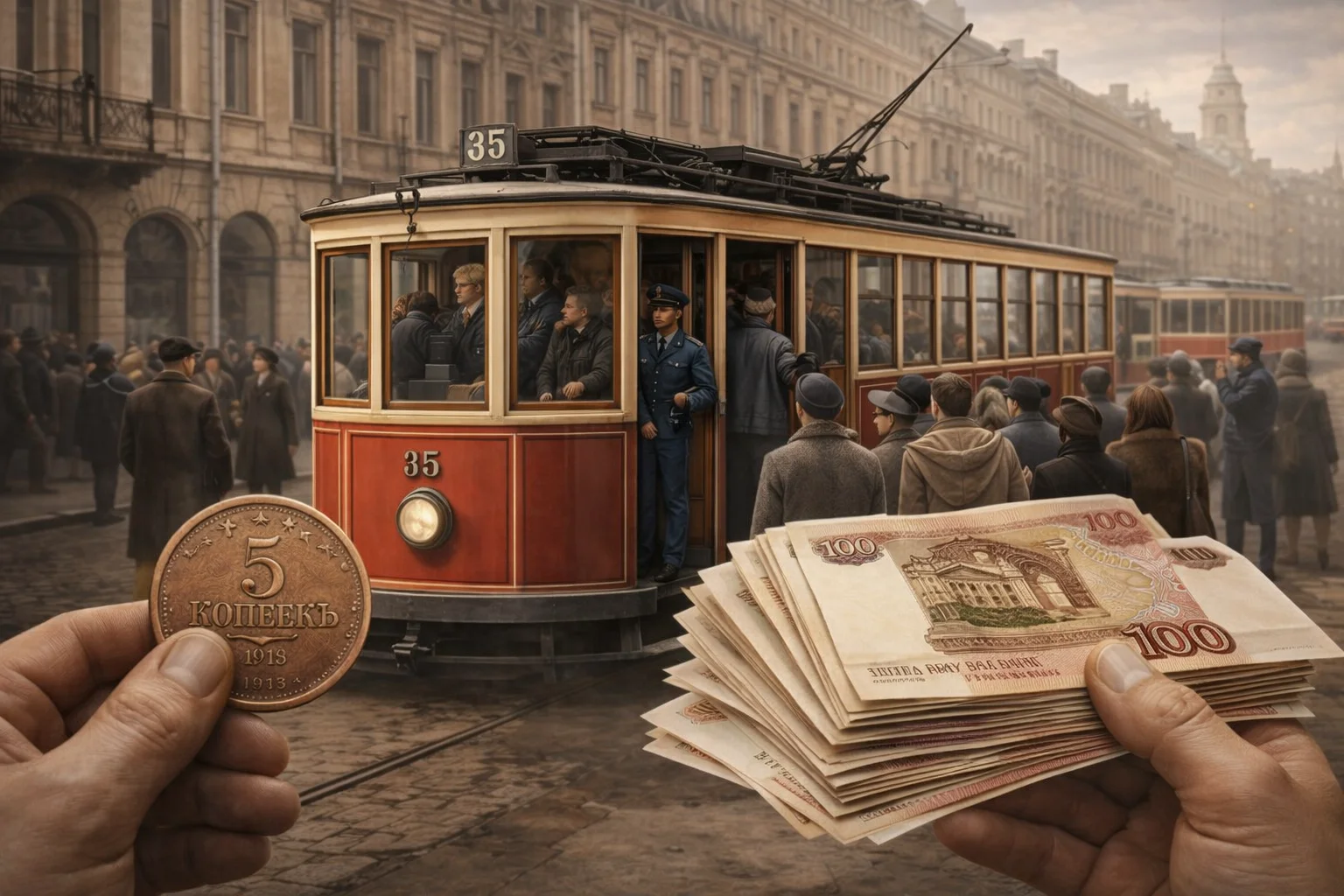 Проезд на трамвае стоил 5 копеек. Электрический трамвай в Петербурге считался удобным и современным видом транспорта, доступным большинству горожан. В пересчёте на сегодняшние деньги это около 100 рублей за поездку.
