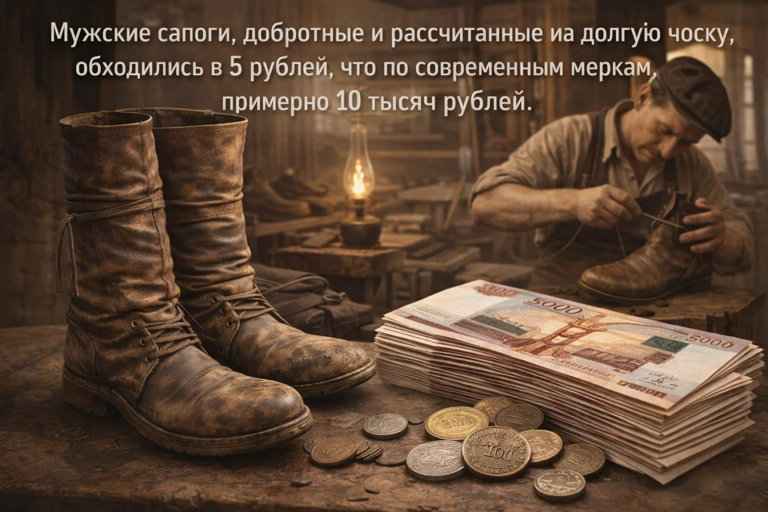 Мужские сапоги, добротные и рассчитанные на долгую носку, обходились примерно в 5 рублей. Такая покупка считалась серьёзной статьёй расходов и по современным меркам соответствовала бы сумме около 10 тысяч рублей. Обувь часто чинили, а не покупали новую.