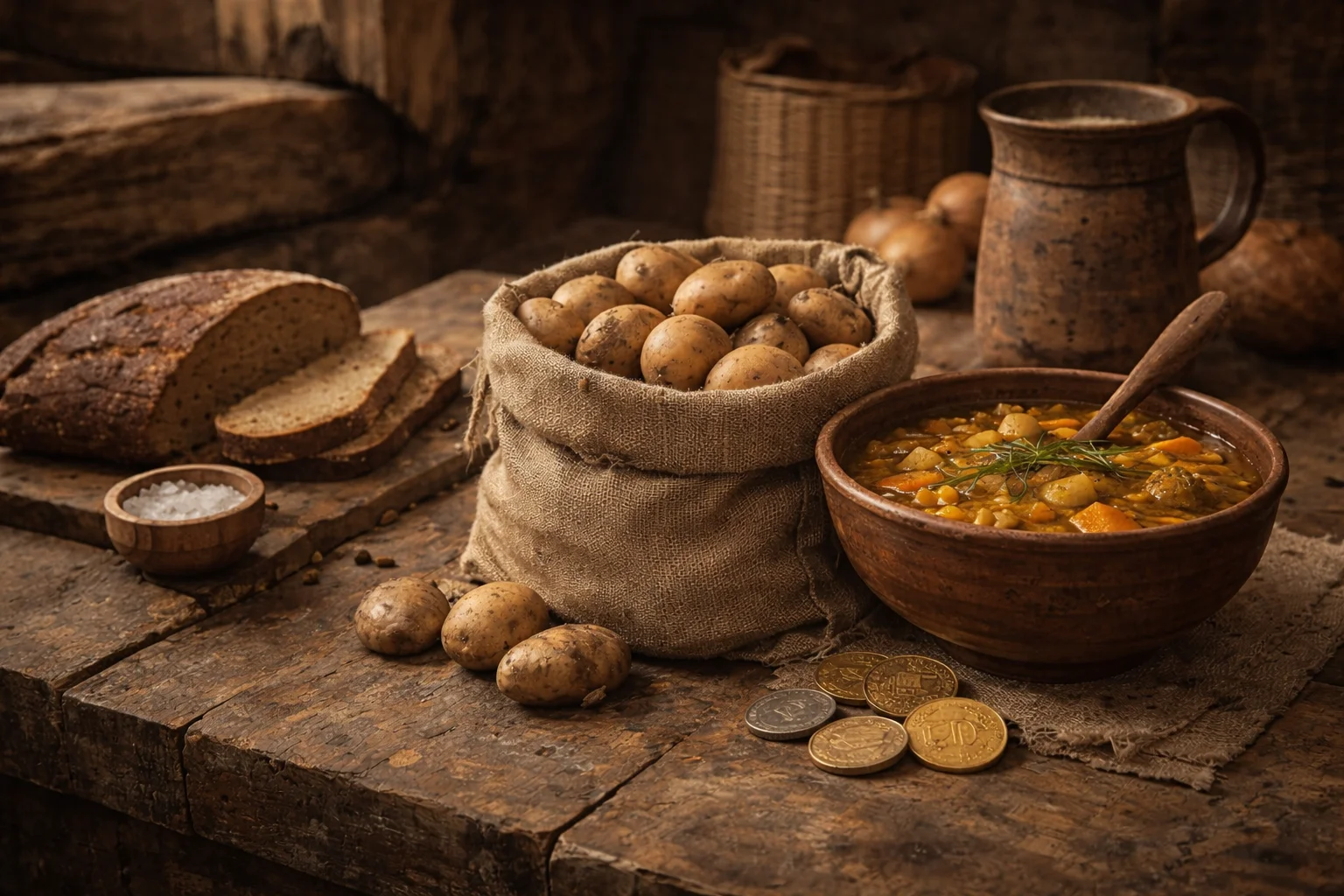 Продукты питания в целом были доступны, особенно базовые. Картофель — один из главных продуктов рациона — стоил около 2,4 копейки за меру. В современных ценах это примерно 48 рублей. Хлеб, крупы и овощи составляли основу питания большинства семей.