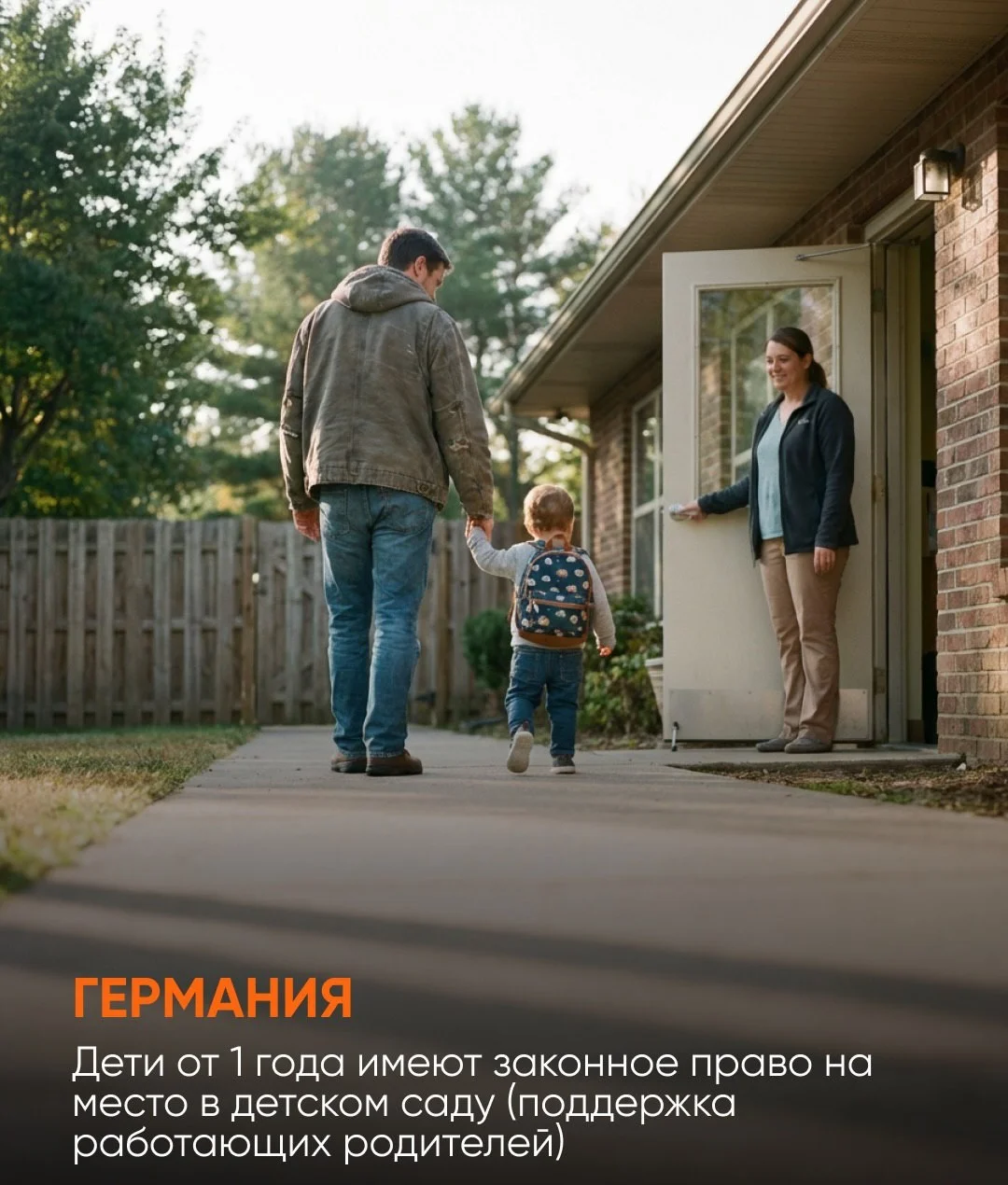 Германия активно поддерживает работающих родителей. По закону дети уже с одного года имеют право на место в детском саду. Это позволяет родителям быстрее возвращаться к работе, не опасаясь за развитие и безопасность ребенка, а также снижает социальное напряжение и способствует равенству возможностей.