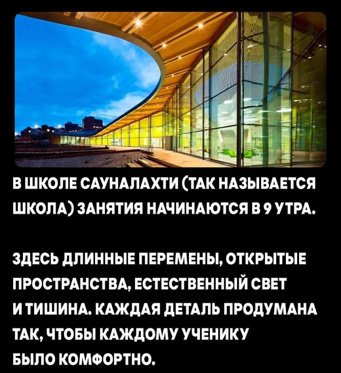 Особое внимание уделяется школьной среде. Учебные здания проектируются так, чтобы детям было комфортно находиться в школе. Длинные перемены, открытые пространства, много естественного света, тишина и зоны для отдыха — всё это снижает уровень стресса и помогает сосредоточиться. Например, в школе Сауналахти занятия начинаются только в 9 утра, что учитывает биологические ритмы детей.