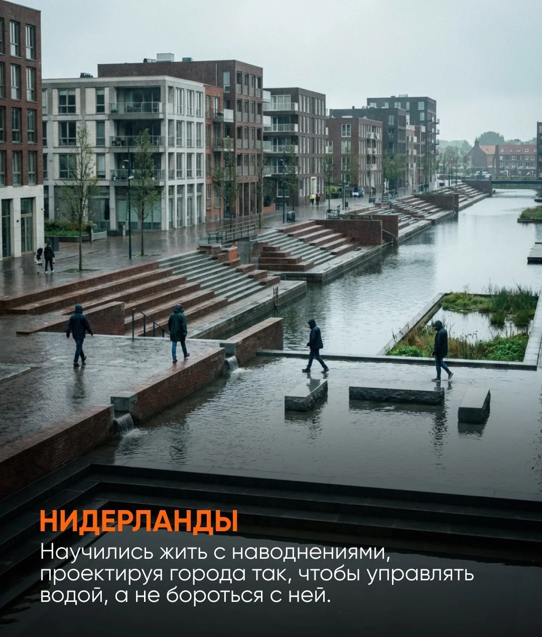 Нидерланды веками боролись с наводнениями, но в итоге сменили подход. Вместо бесконечного возведения дамб здесь начали проектировать города так, чтобы вода могла безопасно заполнять определённые пространства. Каналы, водные парки и гибкая система управления потоками превратили угрозу в управляемый ресурс.