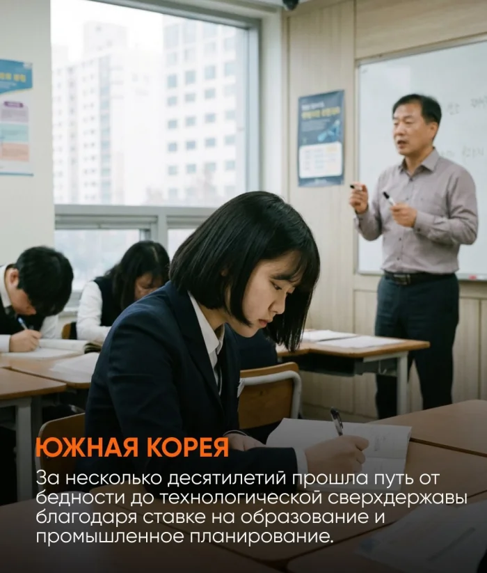 Южная Корея прошла путь от бедной страны до технологической сверхдержавы за несколько десятилетий. Ключевую роль сыграли инвестиции в образование, промышленное планирование и поддержку экспорта. В результате страна стала одним из мировых лидеров в электронике, автомобилестроении и цифровых технологиях.