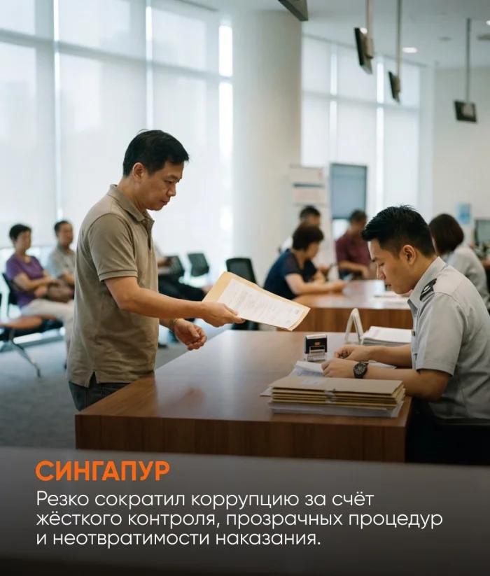 Сингапур добился резкого снижения уровня коррупции благодаря сочетанию строгих законов, прозрачных процедур и неизбежности наказания. Здесь не делают скидок на статус или положение, а государственные служащие находятся под постоянным контролем. В результате доверие к власти стало одним из самых высоких в мире.