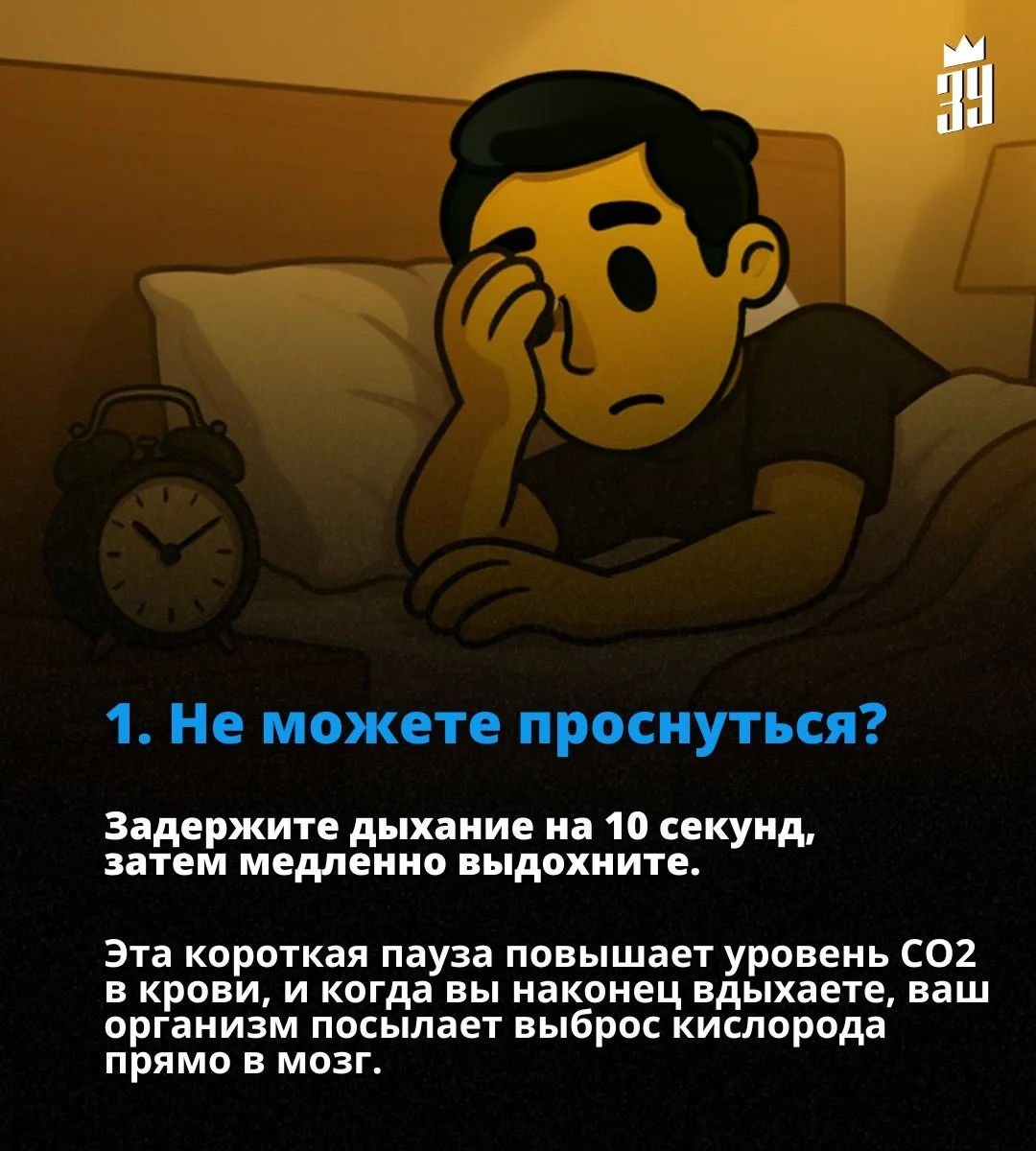 Если утром голова «ватная», попробуйте задержать дыхание на 10 секунд, а затем медленно выдохнуть. Кратковременное повышение уровня углекислого газа в крови заставляет организм при следующем вдохе активнее насыщать мозг кислородом. Это помогает быстрее выйти из состояния сонливости.