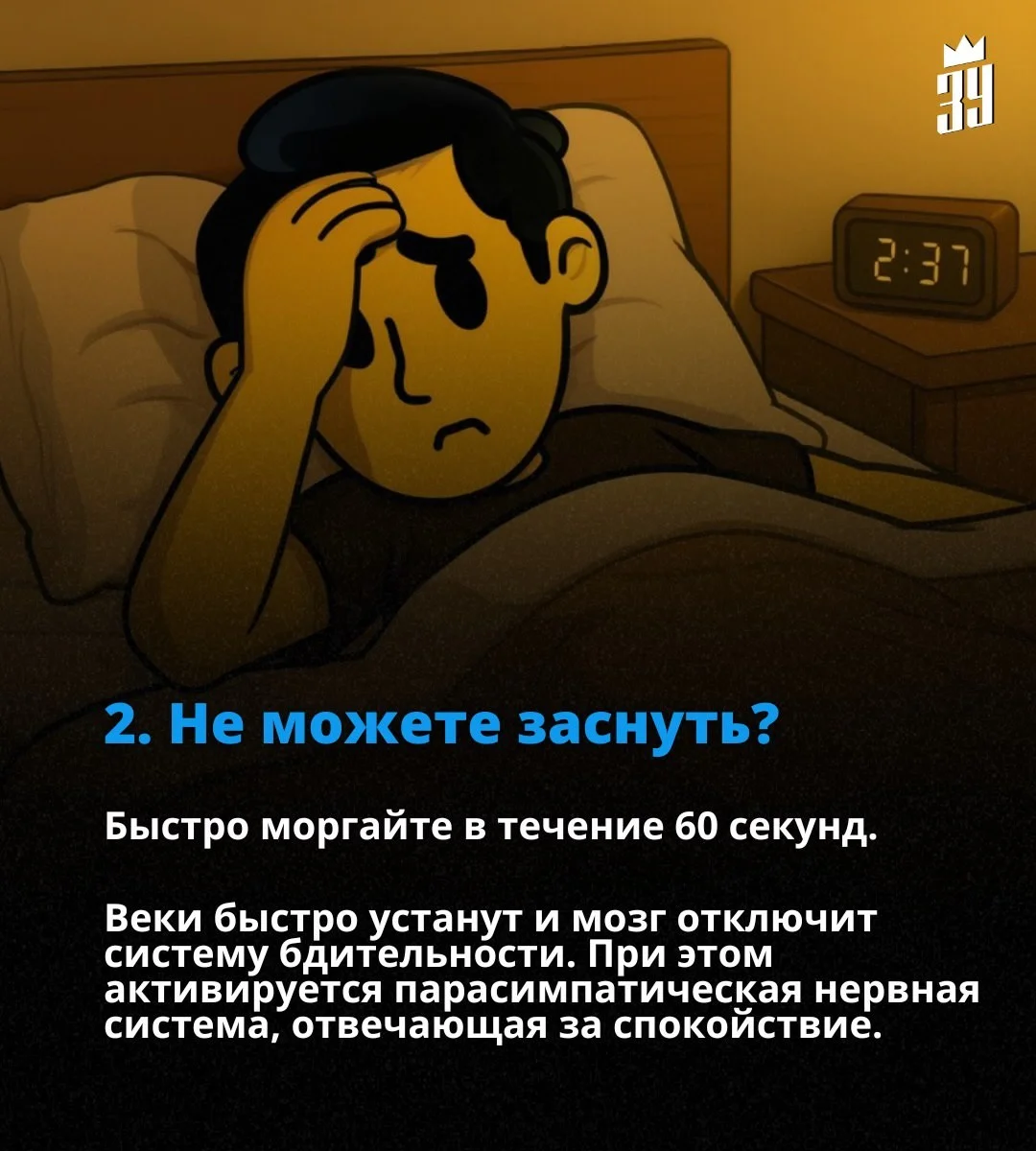 Когда мысли не дают уснуть, быстро моргайте в течение 60 секунд. Веки быстро устанут, и мозг снизит активность системы бодрствования. Параллельно активируется парасимпатическая нервная система, отвечающая за расслабление и подготовку ко сну.