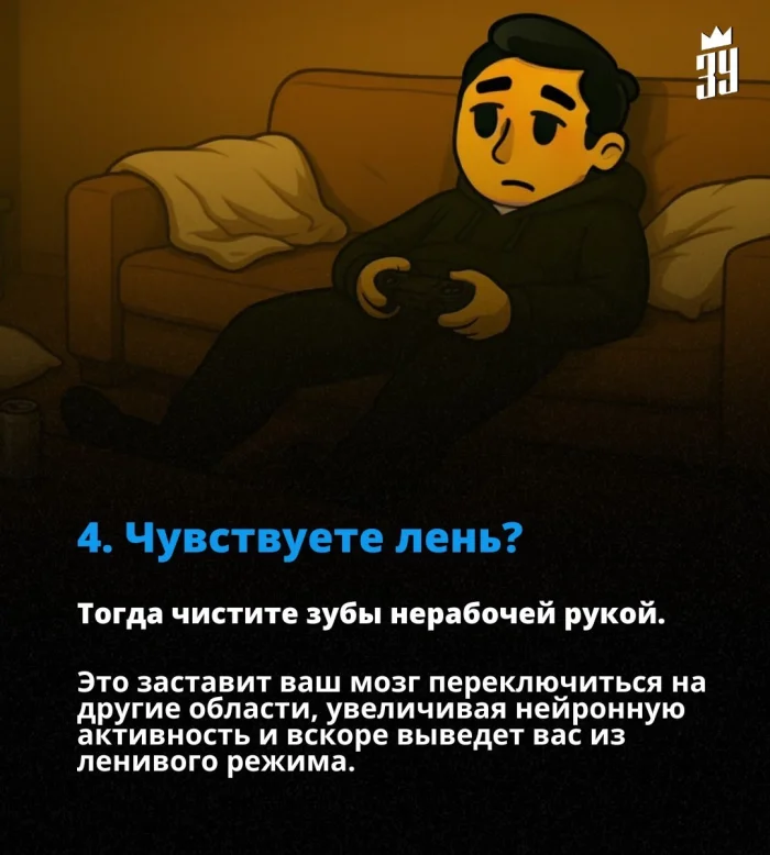 Почистите зубы нерабочей рукой. Это простое действие вынуждает мозг активировать новые нейронные связи, повышая общую нейронную активность. Такой «сбой шаблона» помогает выйти из ленивого режима и включиться в деятельность.