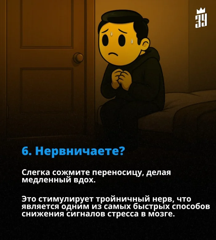Слегка сожмите переносицу и сделайте медленный вдох. Это воздействует на тройничный нерв — один из самых быстрых путей снижения стрессовых сигналов в мозге. Эффект ощущается практически сразу.
