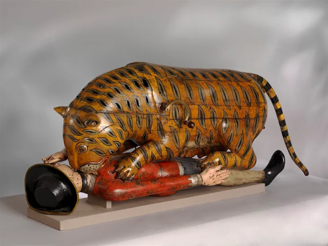 Жертва, практически в натуральную величину, лежала на спине, пока хищник впивался клыками ей в горло. В боку тигра торчала рукоятка — при её вращении встроенный механизм плавно поднимал и опускал руку несчастного, одновременно срабатывая встроенные механические мембраны, которые воспроизводили рычание зверя и пронзительные, душераздирающие крики. Откидная панель на теле тигра открывала доступ к миниатюрному органу с клавишной клавиатурой.
