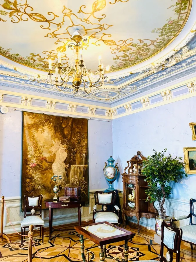 Финал маршрута — Большой танцевальный зал. Пространство для балов и приёмов, где идеально всё: лепной потолок, зеркала, паркет, люстры. Сегодня здесь проходят концерты и культурные события — и кажется, что этот зал по-прежнему живёт своей светской жизнью.