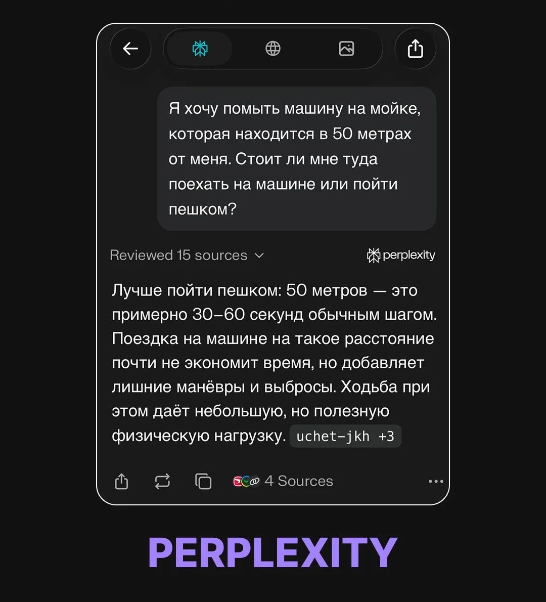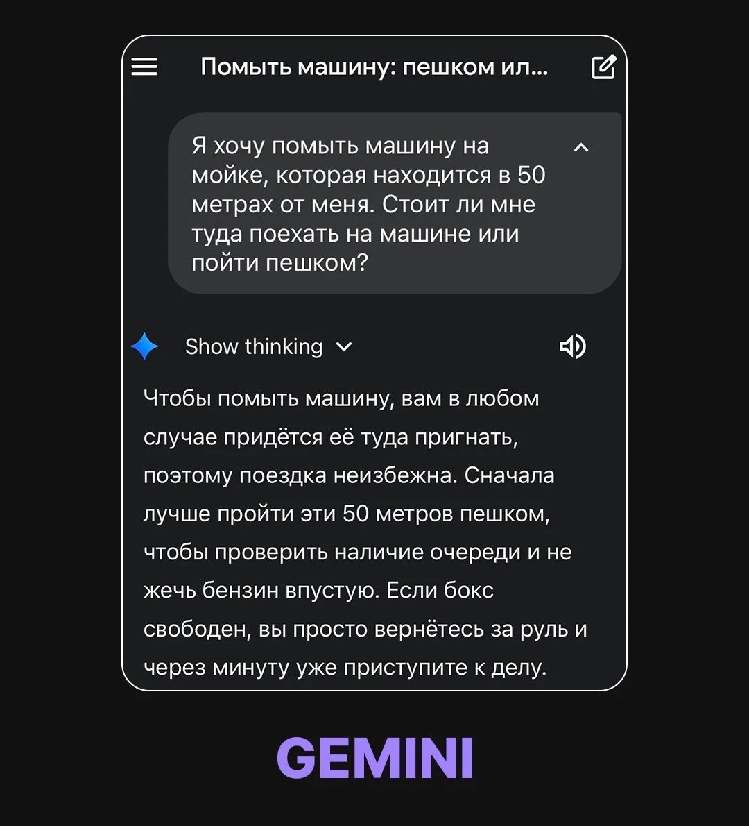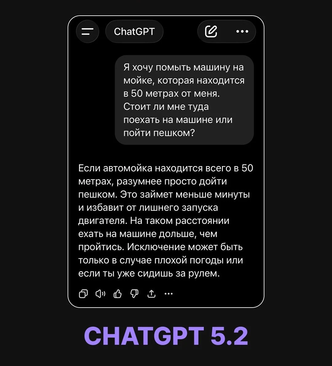 DeepSeek рассудил иначе. Он отметил, что для мойки машину нужно доставить на место. Если вы в 50 метрах от мойки и машина рядом, логично подъехать на ней. Пешком вы дойдёте, но цель не будет достигнута.