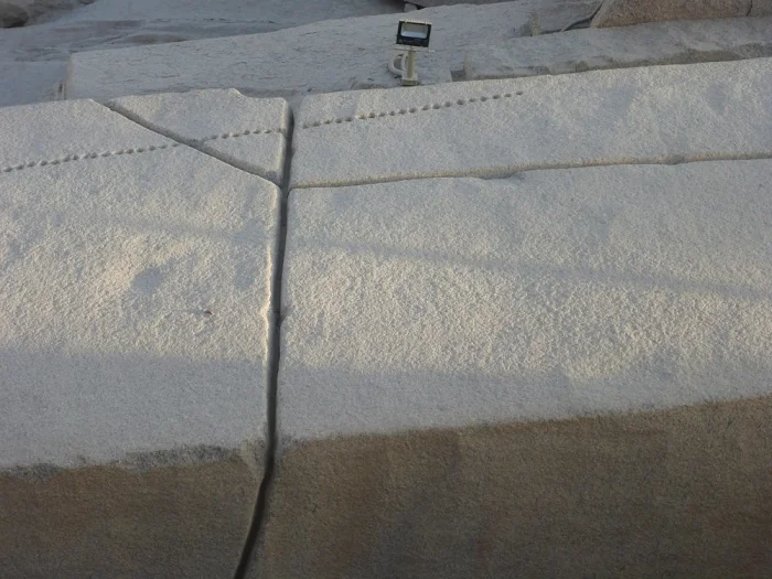 Вдоль намеченной линии выдалбливали узкие канавки, куда вбивали деревянные клинья. Затем их обильно смачивали водой: древесина разбухала, создавая колоссальное давление, и гранит раскалывался строго по заданной линии.