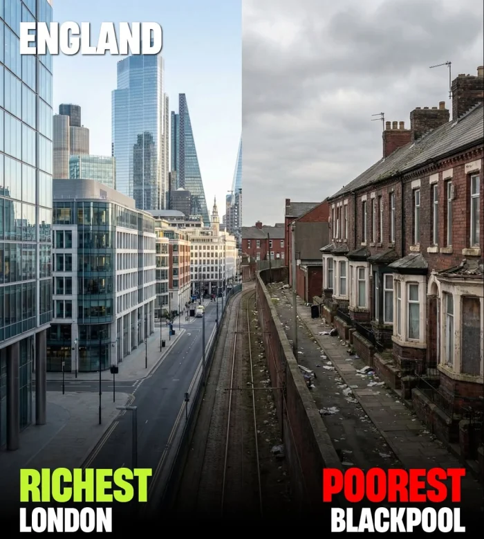 Лондон — финансовая столица Европы, глобальный центр банков, страхования и международной торговли. Высокие зарплаты и дорогая недвижимость контрастируют с положением в Блэкпуле — городе, который после упадка традиционного туризма столкнулся с ростом безработицы и снижением доходов населения.