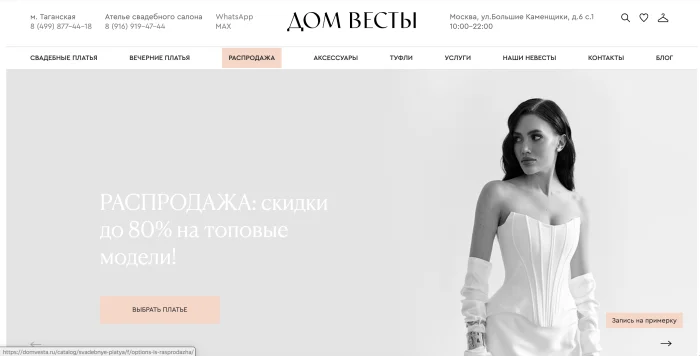 Масштабный центр свадебной и вечерней моды, который напоминает настоящий гипермаркет нарядов для торжеств. В наличии всегда находятся сотни разнообразных моделей всех размеров. Из-за таких колоссальных объемов в "Доме Веста" можно подобрать образ абсолютно на любой, даже самый скромный бюджет. Этот формат салона идеально подходит тем невестам, которые не хотят тратить время на поездки по разным шоурумам и предпочитают примерить десятки совершенно разных фасонов в одном месте за один день.