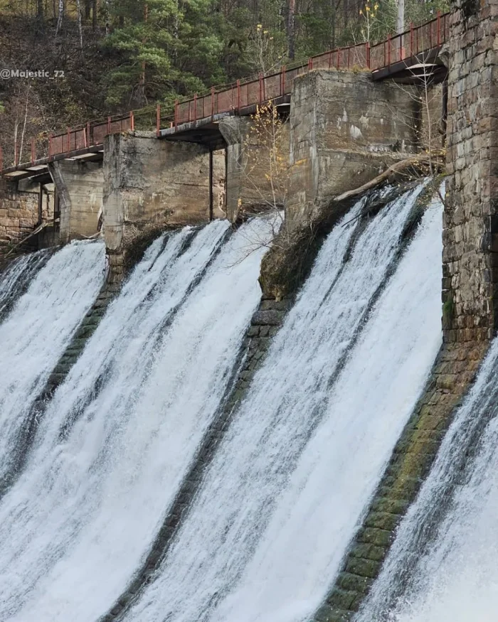 Особенность ГЭС — её конструкция. Плотину построили из дикого камня, добытого прямо в окрестностях. Благодаря этому сооружение идеально вписалось в природный ландшафт Урала. Длина плотины составляет около 125 метров, а высота достигает примерно 21 метра. Каменная кладка, мощный поток воды и суровые уральские скалы вокруг создают впечатляющую картину.