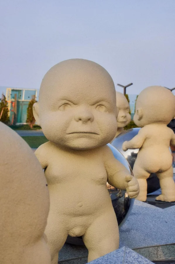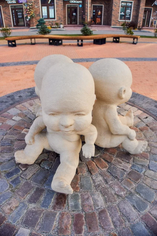 Эти фигуры младенцев выполнены в современном художественном стиле. В их образе есть немного гротеска, немного иронии и явный отказ от привычной «милоты», которая обычно ассоциируется с детскими скульптурами.