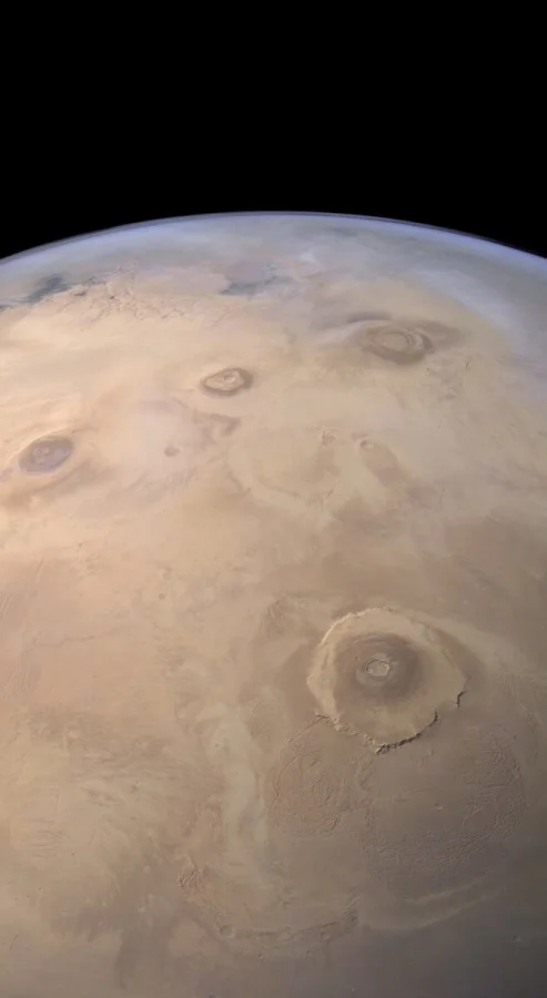 Панорамный снимок Марса с орбитального аппарата Европейского космического агентства (ESA) "Марс-экспресс". Справа внизу виден огромный потухший вулкан Олимп, а чуть выше выстроились в ряд горы-вулканы Арсия, Павлина и Аскрийская