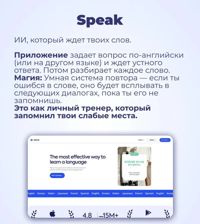 Главная проблема классических приложений — вы учите слова и правила, но не говорите. В итоге возникает языковой барьер. Современные ИИ решают это иначе: вы сразу начинаете разговаривать, а обучение происходит в процессе.