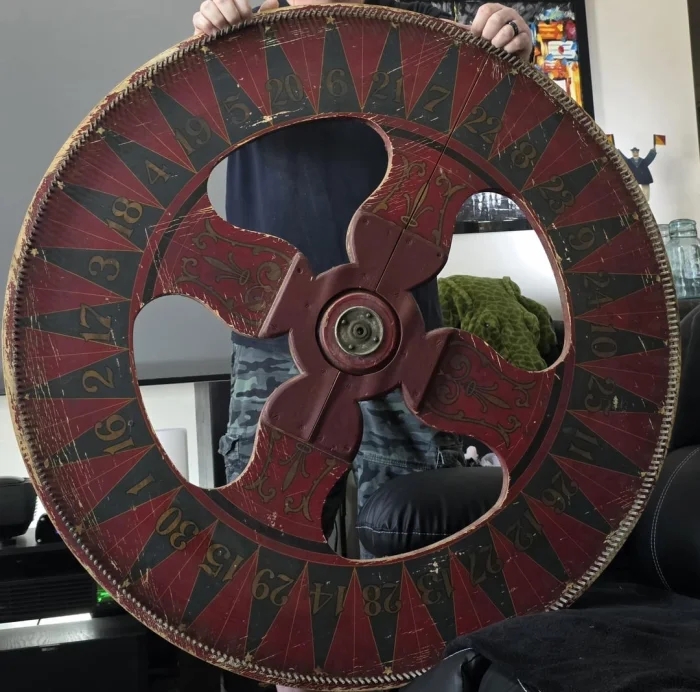 Старое колесо, ранее использовавшееся в азартной игре «Колесо удачи», является одним из типов лотерейных аппаратов, часто встречающихся на ярмарках, в зонах отдыха и цирковых представлениях.