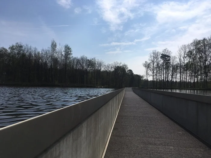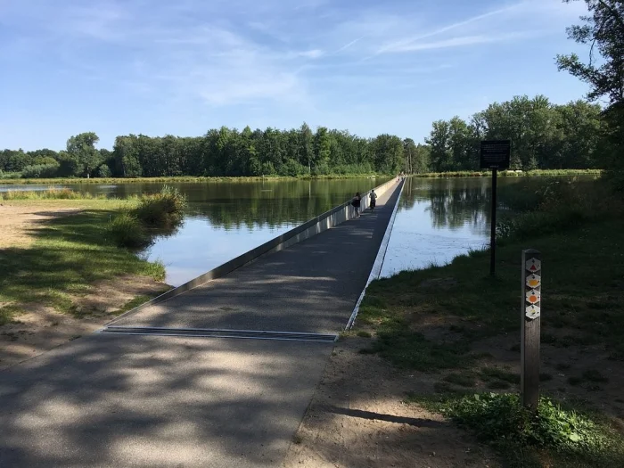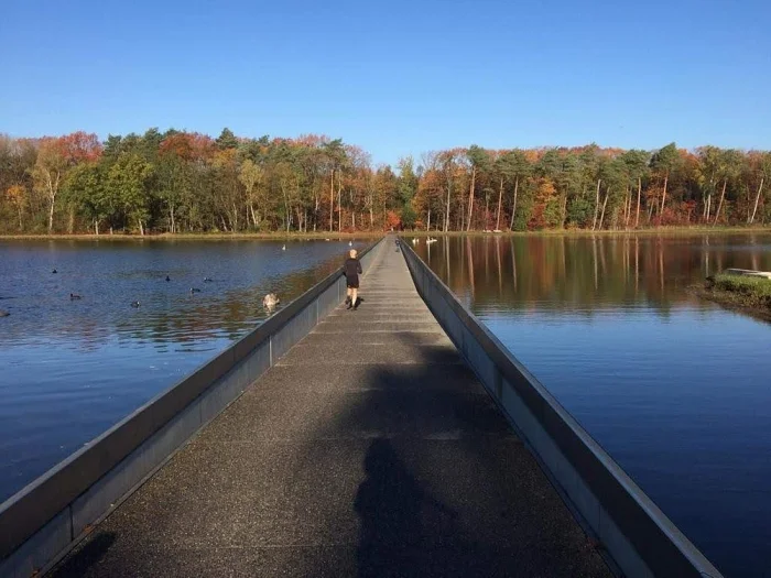 200-метровая трасса не проходит над озером — она словно вплетается в него, погружаясь почти на полтора метра ниже уровня воды. Глаза велосипедиста оказываются на одном уровне с зеркальной поверхностью пруда, а по обе стороны — лишь бескрайняя водная гладь. Летом можно встретиться взглядом с проплывающей уткой, а зимой, сквозь ледяную панель, вглядеться в отражение неба — будто мир перевернулся, и ты плывёшь по небу, а не по земле.