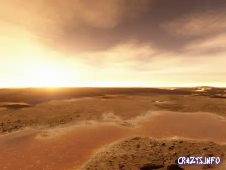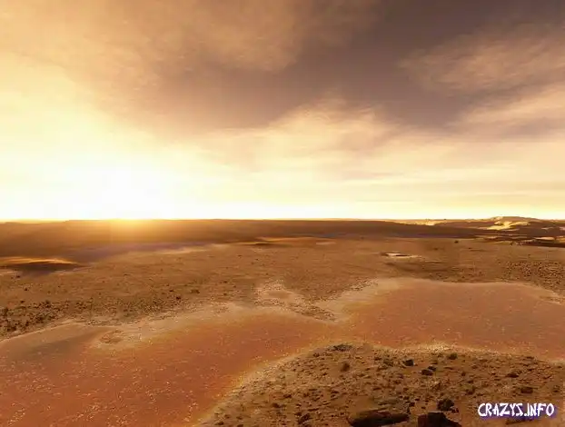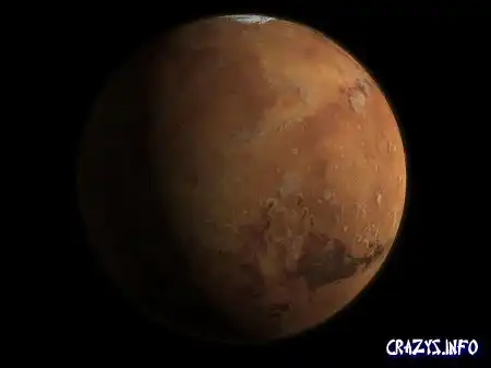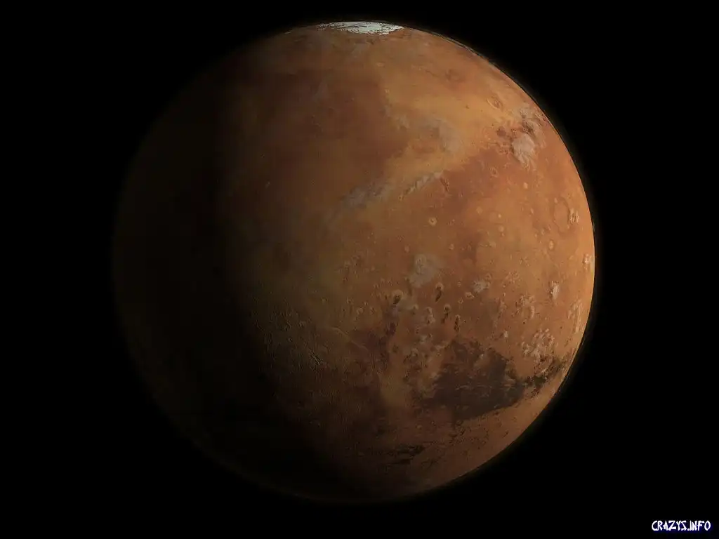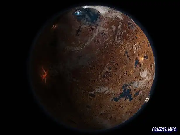Возможно так выглядел Марс приблизительно 4 миллиарда лет назад. В северном полушарии расположен Vastitas Bolearis, заполненный водой, и северный полюс с небольшим количеством льда вокруг. На территории большого озера Меридиан, в правой части, аппарат Opportunity нашёл свидетельства существования морской воды. Слева наблюдается мощнейшая вулканическая деятельность.