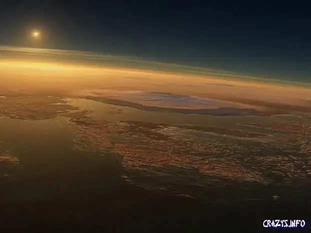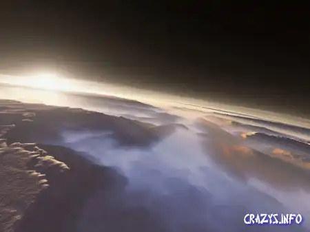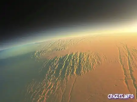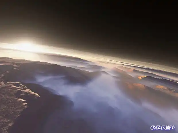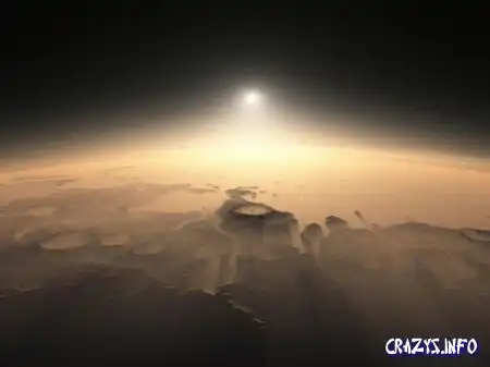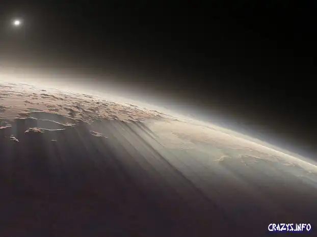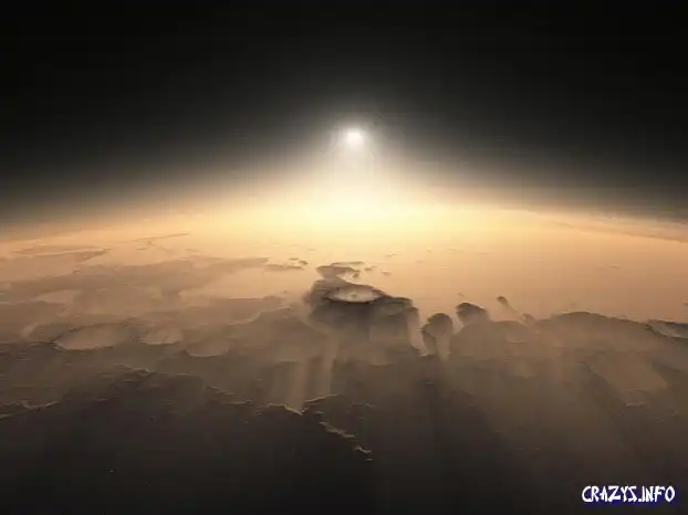 Горный хребет Hellas Planitia. Лучи Солнца видны в пыльной атмосфере.