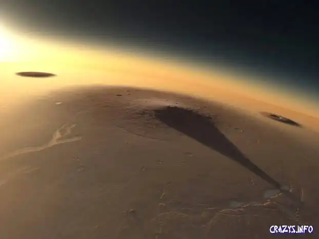 Арсиа Монс и другие вулканы в районе Тарсис. На изображении так же показаны туман и пыль марсианской атмосферы. Этот вулкан возвышается над ближайшими равнинами более чем на 20 км, и имеет приблизительно 450 км в диаметре.