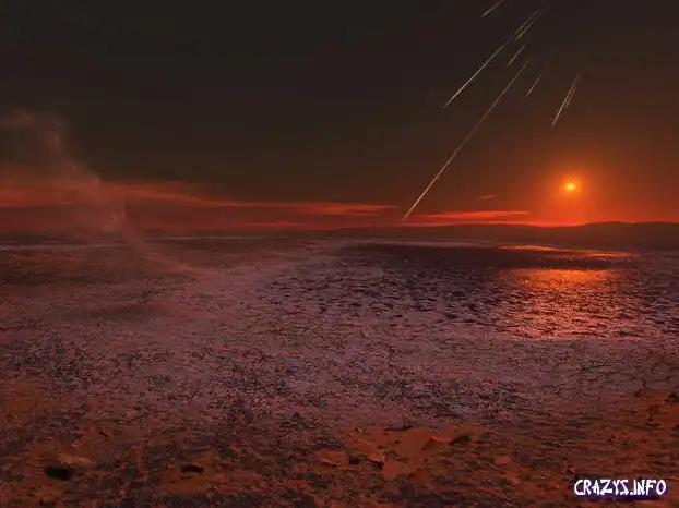 Марс в течение периода потери воды несколько миллиардов лет назад.Видны солевые депозиты, трещины в грязи и падающие метеоры.