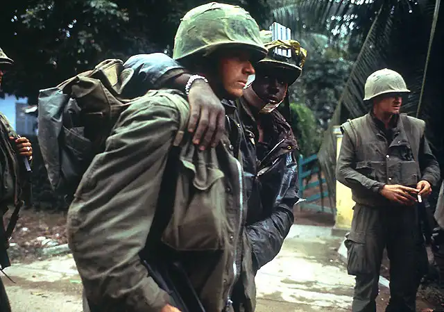 Морской пехотинец помогает своему раненому товарищу эвакуироваться.