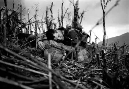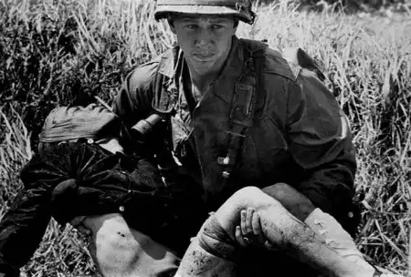 Морпех спасает раненого товарища под вражеских огнем. 1967