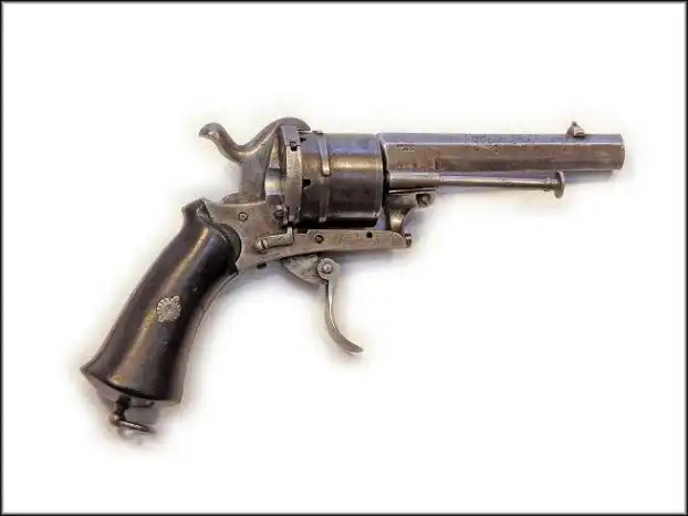 Данный экземпляр типологически относится к револьверам под шпилечный камор-патрон Лефоше (шпилечный патрон с латунной гильзой был изобретен в 1853г.). Капсюль для воспламенения заряда находился внутри гильзы этого патрона. В боковую стенку гильзы, около донца, была вставлена шпилька, один конец которой размещался напротив капсюля, а другой выступал наружу. Удар курка по наружному концу шпильки передавался капсюлю. Барабаны револьверов под шпилечный патрон имели специальные пазы в каморах – для вхождения в них шпилек при заряжании. Револьверы под шпилечный патрон быстро и широко распространились с середины 19 века. Даже после изобретения патронов центрального боя шпилечные револьверы далеко не сразу вышли из употребления и продолжали производиться до конца 19 и даже в начале 20 веков в качестве оружия самообороны.