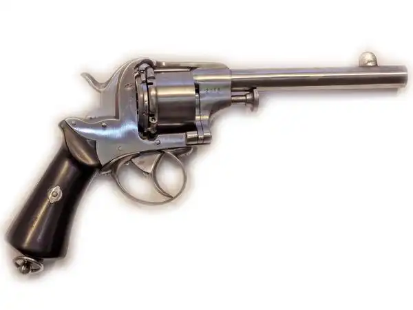 Данный револьвер имеет следы переделки для использования патронов центрального боя (отверстие под ударником курка для ввинчивания дополнительного бойка и соответствующее ему отверстие в задней части рамки, напротив верхней каморы барабана). Деформация пазов барабана для патронных шпилек произошла, вероятно, вследствие прорыва пороховых газов через каморы барабана. Надпись «MOUVEMENT ACIER» («подвижная сталь» или «движущаяся сталь») на стволе револьвера говорит о том, что ствол был произведен из высококачественной стали, изготавливаемой конвертерным способом по технологии, разработанной в 1856-1860 годах Генри Бессемером.