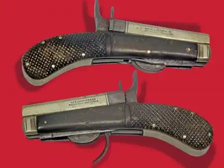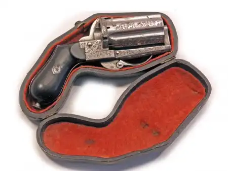 Револьвер относится к так называемым «пеппербоксам» («перечницам») – оружию, в котором скорострельность достигалась применением вращающейся связки стволов. Вначале «перечницы» выпускались с капсюльными замками, после 1851г. – под шпилечный патрон Лефоше, а с конца 1860-х годов – и под патрон центрального боя.