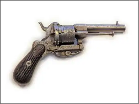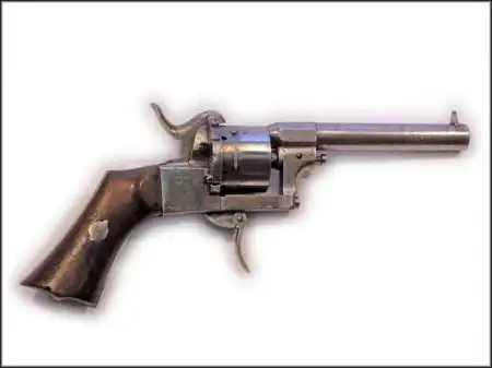 Представленный экземпляр определен как револьвер двенадцатизарядный под шпилечный патрон. В литературе револьверы под этот патрон называются обыкновенно по имени его создателя, французского оружейника Лефоше, хотя конструкции первого из принятых на вооружение шпилечных револьверов (флотский, модель 1855 г.) была создана на основе запатентованного в 1853 г. французом Шенэ ударно-спускового механизма двойного действия.
